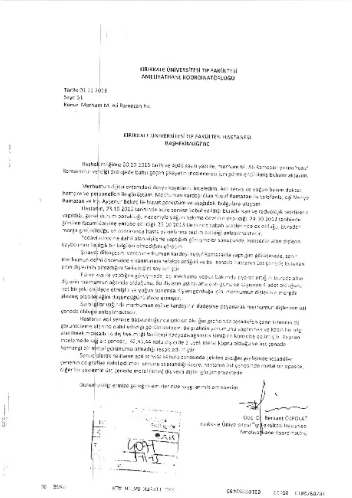 Kırıkkale Üniversitesi Tıp Fakültesi Hastanesi Ameliyathane Koordinatörü Doç. Dr. Berkant Özpolat tarafından yapılan açıklamada şöyle denildi: "Hastanın acil servise başvurduğunda çekilen akciğer grafisinde tesadüfen çene kısmında görüntülendiği görülmektedir. Bu grafinin yorumunu yaptırmak ve kesin bilgi alabilmek maksadı ile diş hekimliği fakültesi radyodiyagnostik kliniğine konsüle edilmiştir. Yapılan incelemede sağ alt çenede, 42, 43 ve 44 nolu dişlerde 3 üyeli metal köprü olduğu ve üst çenede herhangi bir metal görünümü olmadığı tespit edilmiştir. Dolayısıyla hastanın üst çenesinde metal bir opasite diğer bir söylemle üst çenede metal (altın) diş veya dişler görülmemektedir" - KIRIKKALE