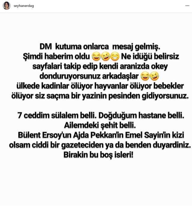 "Sosyal medya içinden çıkılmaz bir hal aldı. İsimsiz bir sayfa benim için Bülent Ersoy'un kızı yazmiş. Reklamı olmasın adını vermiyorum. DM kutum mesajla doldu. Vallahi Ne Bülent Ersoy'un Sezen Aksu'nun ne Muazzez Ersoy'un Ajda Pekkan'ın ne Emel Sayın'ın kızı değilim. Ama Annem ve Anneannem; tabii Babam ve rahmetli Dedem iyi yetiştirmişler, severler beni kızları gibi. Ne olur bu saçmalıkları bırakın. Ülkede kadınlar ölüyor çocuklar öldürülüyor bebekler hayvanlar öldürülüyor. Zamanınızı düzgün işlere harcayın" sözleriyle iddiaları yalanladı. Akalın, Seyhan Erdağ'ın açıklamasının altına"Kız ne güzel bütün miras sana kalır" açıklamasıyla şaşırttı.
